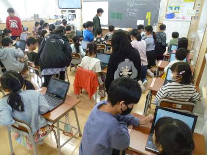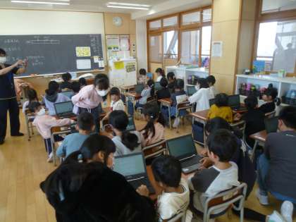 1年生さんが初めてクロムブックを使うのに合わせて、6年生の子供たちがサポートに入りました。