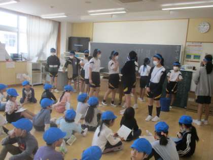 6年生と一緒に応援練習をしました。6年生の声かけに一生懸命答えようとする子供たちでした。