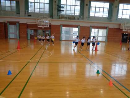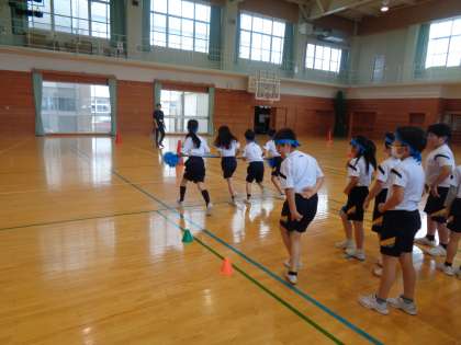 今週末の運動会に向けて、4年生と一緒に台風の目の練習をしました。先週に比べてどんどん早くバーを運んだり跳んだりすることができるようになってきました。各団の4年生を中心に作戦を立てています。どの団が勝つのか、楽しみです。