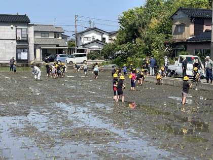 田植え体験の実施にあたり、たくさんの地域のみなさんが、子供たちの応援にかけつけてくださいました。とてもありがたいことだなと思います。おかげさまで、貴重な経験ができました。ありがとうございました。