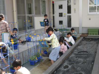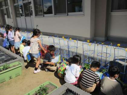 鉢に植えて約2週間が立ちました。お世話している野菜がどうなっているのかじっくりと観察しました。実ができて喜んでいる子供や生長の早さに驚いている子供がいました。