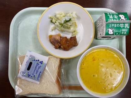 【献 立】 食パン、牛乳 照り焼きチキン イタリアンサラダ かぼちゃポタージュ ブルーベリージャム