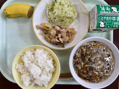 【献 立】 ごはん、牛乳 あっさりチキン そえ野菜 たまごともずくのスープ バナナ