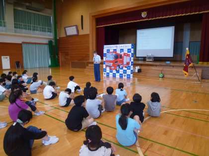 防火・防災教室では、代表児童が119番の通報体験を行いました。今後、実際に火事や事故を目の前にした時、今日体験したことをぜひ生かしてほしいと思います。