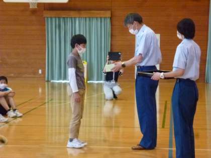 BFCバッジ授与式では、中分署の署長さんからの話があった後、代表児童にBFCのバッジを授与していただきました。誓いの言葉を6年生全員で言い、将来大人になってもクラブで得た知識を生かして火災予防に努めることを誓いました。