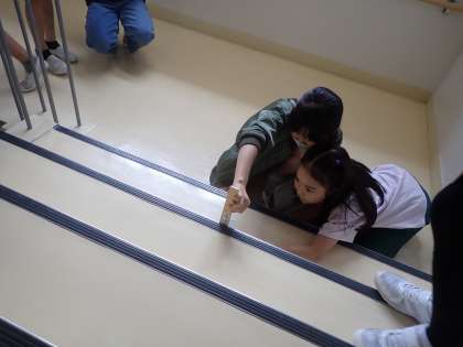 比例の学習を使って、学校の階段(1階から3階)の高さを測りました。
