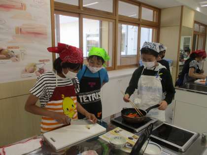 包丁を正しく使って野菜を切ったり、火加減に気を付けながら野菜炒めを作りました。「味付けが上手にできた!」「にんじんがかたかった!」など感想はさまざまでしたが、調理してみて、おいしく作るためにはどれくらいの細さで切ればよいのかなど、しっかり学ぶことができましたね!