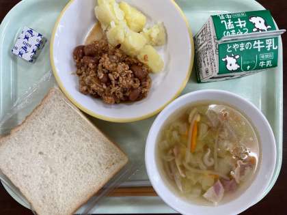 【献 立】 食パン、牛乳 チリコンカン こふきいも キャベツスープ ポケットチーズ