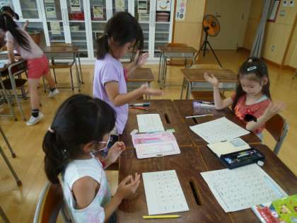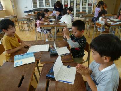 自分で、リズムを作ってたたいてみたり、グループでリズムを作って合わせたりしました。どうやったらたたきやすくなるか、一生懸命考えている姿がみられました。