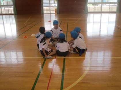 「宝取り鬼」に取り組んでいます。どうしたらタグが取れるか、取られないかを考えながら取り組んでいます。