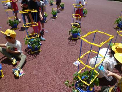 つるがのびてきたので支柱を立てたり、追肥をしたりしました。どんどん大きく育つのが楽しみですね。