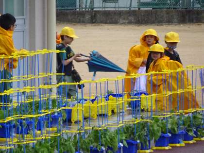 1年生のアサガオも、風で倒されてしまいます。大急ぎで壁の方に寄せ、倒れないようにしていました。