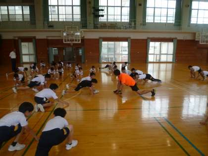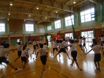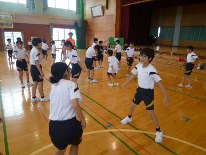 体全体を使って友達とジャンケンをしたり、腕の振り方や足の切り返しを練習したりしました。