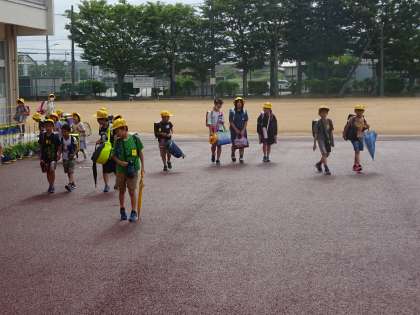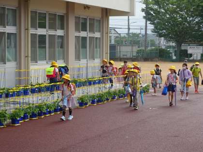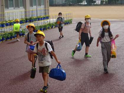 朝の子供たちです。手にはプールバックを持っている子供たち。