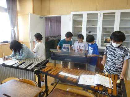 様々な楽器の響きを生かして、合奏を行います。 グループごとに順番や音程を確認しながら練習を行いました。