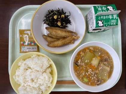 【献 立】 ごはん、牛乳 わかさぎのフリッター ひじきのごま和え 冬瓜のそぼろあん 野菜ふりかけ