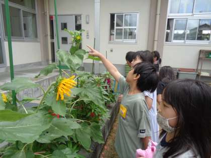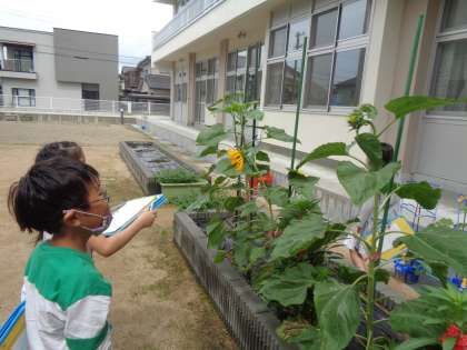 5月頃に植えたホウセンカやヒマワリ、オクラなどの植物が花を咲かせています。子供達はつぼみや花の形を観察しました。ヒマワリと自分の身長と比べて「追い越された〜!」とびっくりしたり、みんなのホウセンカを見比べて「私のホウセンカは茎の色が緑色だから、白い花が咲くと思う!」など、様々な視点で植物の成長を楽しみました。