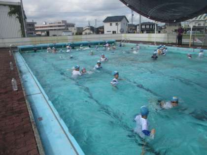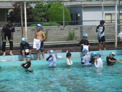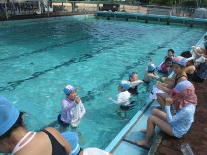 服を着てプールに入り、水を含んだ服の重さを体験したり、万が一おぼれそうになったときに浮く練習をしたりしました。