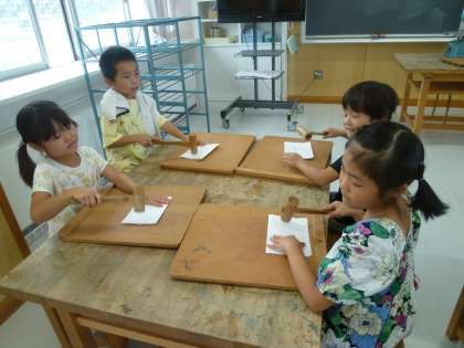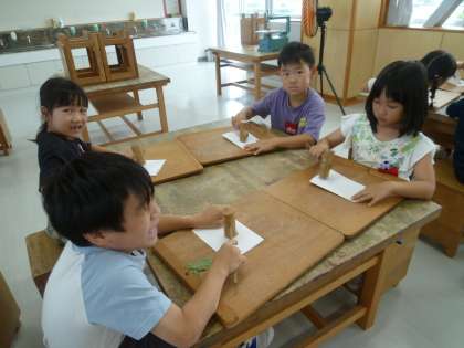 朝顔をつみ、たたきぞめをしました。たたいて、どんな色や形に写っているかわくわくしながら取り組んでいました。