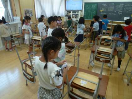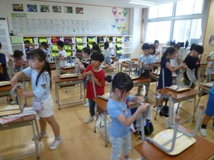 終業式を終え、1学期間使った椅子、机、下駄箱を綺麗にしました。ほこりや汚れがなくなるまで、ピカピカに磨きました。