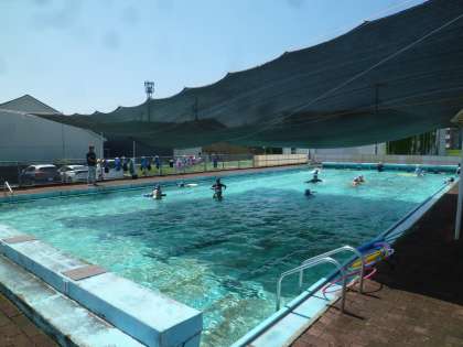 今日から夏休みが始まり、数十名の子供たちがプールに入りに来ていました。暑い中、友達と水をかけあったり、すいすいと泳いだりして気持ちよさそうでした。