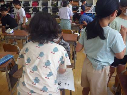 始業式の後に行った学級活動では、夏休みの思い出ビンゴを行い、友達とじゃんけんをして勝った人から「すいか食べた?」などと質問しました。久しぶりに顔を合わせた子供たちでしたが、お互いの思い出を聞くことができて笑顔を浮かべうれしそうでした。