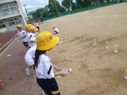 昨日の話し合いで、「射的をしたい!」という意見が多かったので、家からペットボトルを持ちよって、射的をしました。「100点とれた!」「2人で狙ったら倒れたよ!」と大盛り上がりでした。ハートやキャラクターのお絵かきもしました。