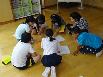 今日は、全校児童のアンケート結果を基に、どんな学校をつくりたいかについてグループで話し合いました。