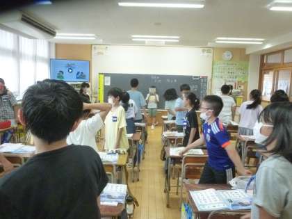 5年生 外国語科 公開日 2023/09/07 更新日 2023/09/07 5年生 「〜できる」の「can」について学習するために、サイモンゲームをしました。 よく耳を傾けて、間違えないように動くことが出来ました。