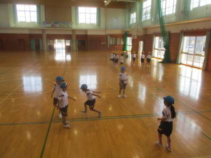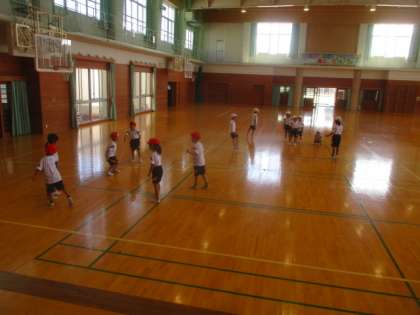 体育では、長縄跳びを行いました。跳ぶが怖いと話す子供も多くいましたが、団毎に分かれて取り組み、楽しみながら体を動かすことができました。