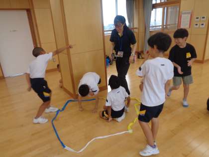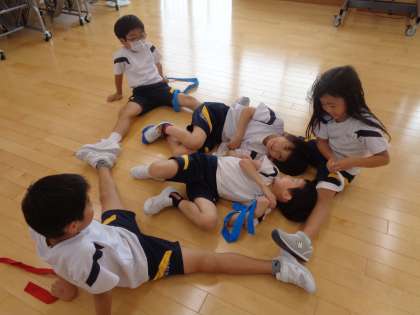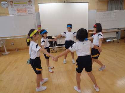 今週の体育では、体全体で表現する活動を行っています。今日は「カレー作り」の表現をグループで考えました。「トントントン」と材料を切ったり「ぐつぐつ」煮込んだりと、グループごとに様々な動きを楽しそうに考えていました。