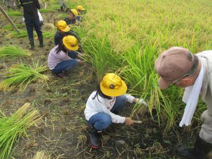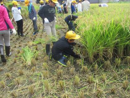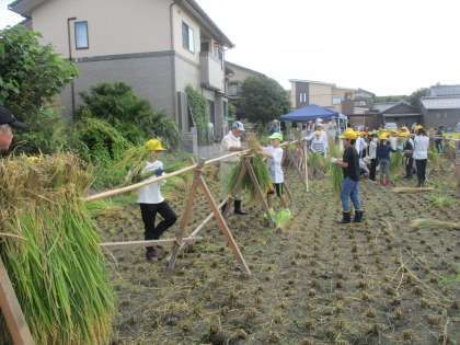 友達同士で「教えてあげるよ」といいながら、見本を見せたり、「縛り方を教えてください」と言って地域の方に質問したりしながら、稲刈りに取り組んでいますした。