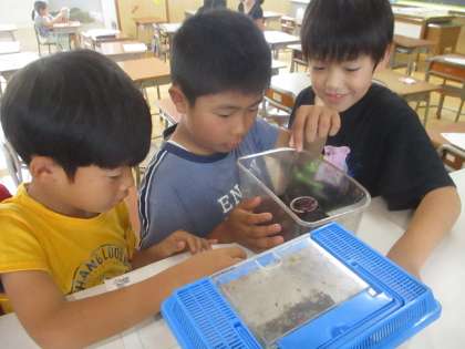 友達が持ってきてくれた生き物のお世話をしてくれている仲間がいます。生き物にえさをあげたり、声をかけたり、楽しそうにお世話をしています。友達にも生き物にも優しく接する様子がとてもすてきです。