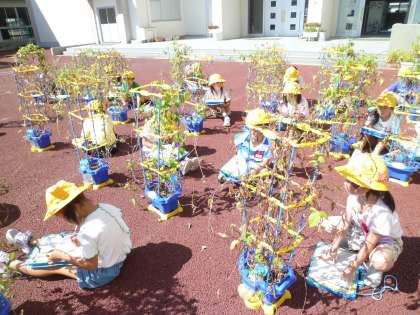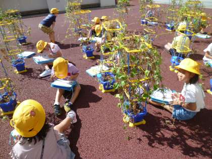 種ができてきたり、つるや葉が茶色になってきたり、夏と比べて変わったところを観察カードにかきました。「葉がぱりっとしている!」「虫が葉を食べたみたい。」と、色々な発見ができました。
