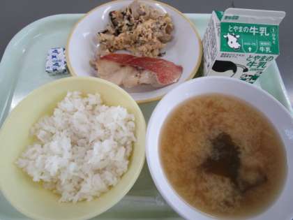 【献 立】 ごはん 牛乳 赤魚の塩焼き 卵ときくらげの炒め物 みそ汁 ポケットチーズ