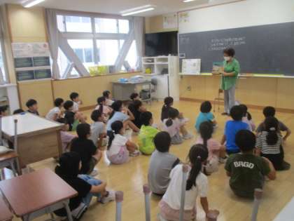 お話の会の方に読み聞かせをしていただきました。興味津々で、次の展開を予想しながら聞いていました。