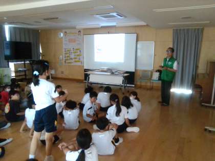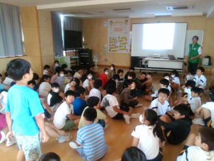 夏休み中に取り組んだ環境チャレンジ10の取り組み結果について、講師の坂東先生に教えて頂きました。子供たちは、今回の結果のデータを見て、「節水を意識すること」や「その都度電気を消すこと」が二酸化炭素の削減につながったことを実感していました。