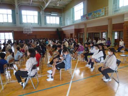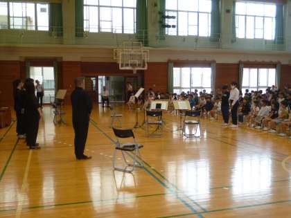 6年生の代表児童が始めの言葉を述べ、演奏会で楽しみにしている曲を全校の前で紹介していただきました。