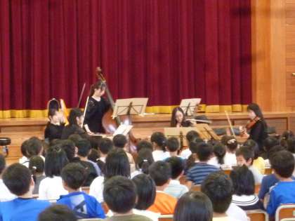 バイオリン・ビオラ・チェロ・コントラバスの4つの弦楽器による生演奏を聞くことができました。子供たちはそれぞれの音色を聞き分けたり、奏でられる曲を心地よく聞き入ったりしました。まさに「芸術の秋」です。
