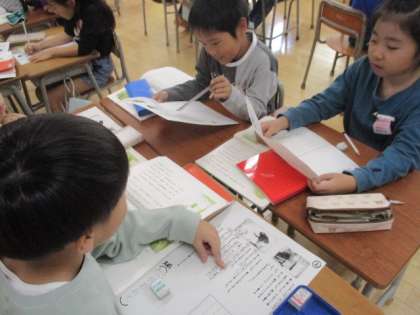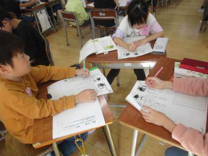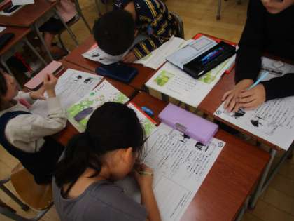グループの友達と音読の仕方を考えました。「急いでいる感じは早く読むといいんじゃないかな。」「かたつむりくんのせりふは自信満々の顔で読もう。」など、楽しく考えました。また、かえるくんが自分でお手紙をわたさなかった理由を、たくさん想像しました。かえるくんの気持ちを色々な方向から考えることができました。