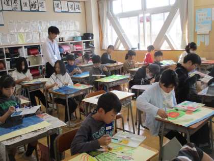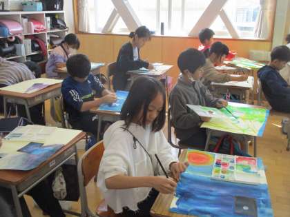 図工の時間に「見たことがない自然の世界」を絵に表しました。一枚の写真からイメージを広げ、グラデーションや線、点などで描きました。