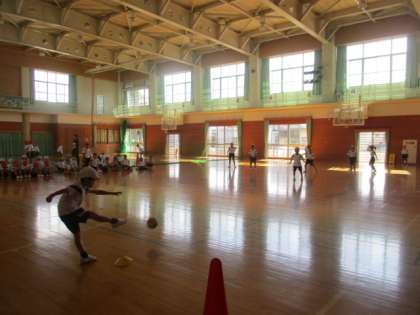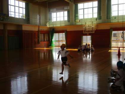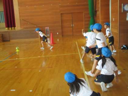 体育ではキックベースボールを行っています。蹴り方の練習をしたり、友達と声をかけ合ってボールを拾ったりしました。少しずつルールを覚えてきて、練習試合をしてみました。試合をしてみると、点数を取るためのコツに気付けたようです。友達とたくさん体を動かして、楽しそうな子供たちでした。