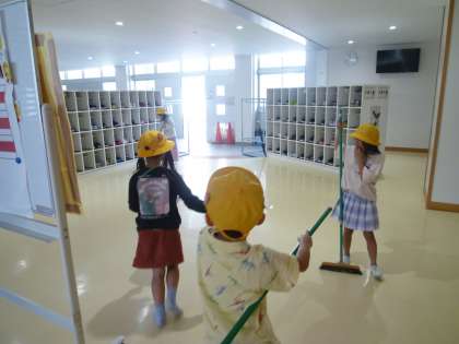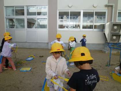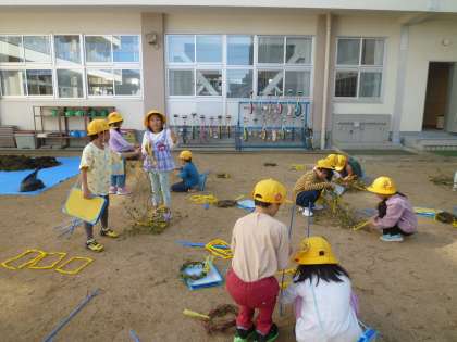 あさがおのつるでリースを作りました。ペアで協力して、つるを巻いたりとめたりすることができました。頑張って育てたあさがおが変身しましたね。汚れてしまった廊下や、中庭の掃除も一生懸命していて素晴らしかったです。
