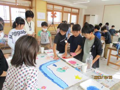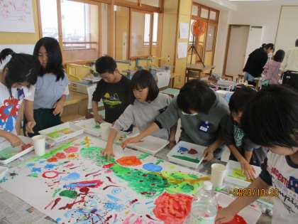 テーマは「命、つながり」。指と水彩で自分たちの思いで描きました。