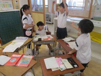 登場人物のがまくん、かえるくんなどになりきって音読劇をしました。成果発表会で、セリフに応じた動きや気持ちの込め方を練習してきたため、とても上手にできていました。