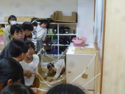 ハロウィンに関する手作りのビンゴゲームや、クモの巣のようにはりめぐらされた網の中を音を出さずに歩けるかを試すゲームをしたりしました。