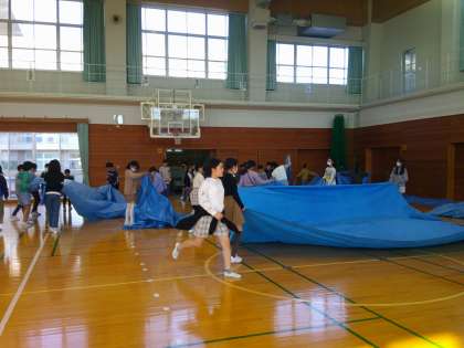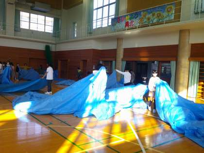 ビニールシートを敷いたり、いすを並べたりしてもちつき大会に向けての準備をしました。