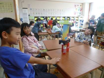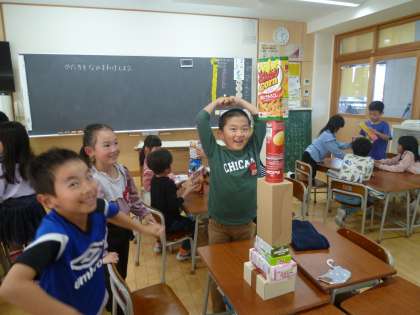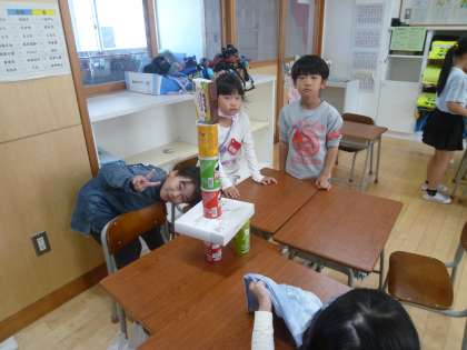 どうやって立てたら、高くタワーができあがるか考えました。大きい箱を下にしたり、丸い形の箱を上にのせたりし、うまくたてることができました。