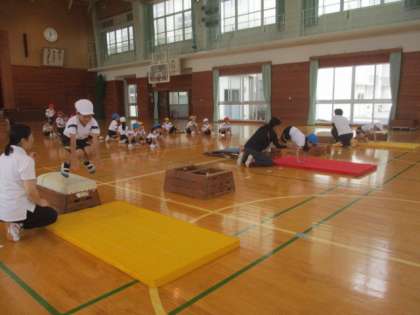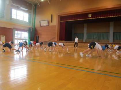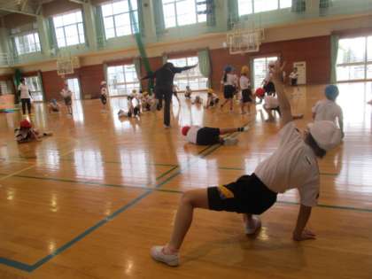 富山市スポーツ協会と富山市役所スポーツ健康課の指導者の方が来てくださり、跳び箱の練習の仕方を教えていただきました。すぐに跳び箱を使うのではなく、跳び箱を跳ぶために必要な体の使い方に慣れるところから教えていただきました。簡単そうでやってみると難しい動きに、子供たちは楽しそうに取り組んでいました。