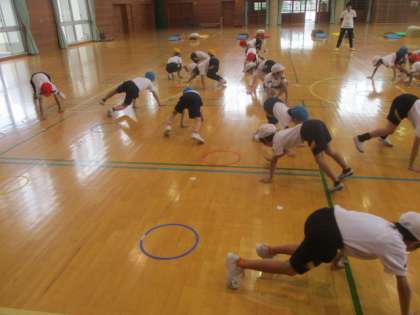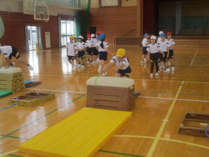 富山市スポーツ協会と富山市役所スポーツ健康課の指導者の方が来てくださり、跳び箱の練習の仕方を教えていただきました。すぐに跳び箱を使うのではなく、跳び箱を跳ぶために必要な体の使い方に慣れるところから教えていただきました。簡単そうでやってみると難しい動きに、子供たちは楽しそうに取り組んでいました。